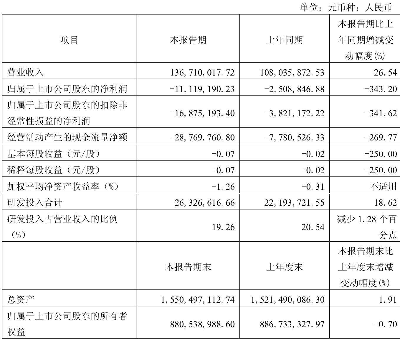 中证智能财讯智洋创新(688191)4月26日披露2025年第一季度报告。公司实现营业总收入1.37亿元,同比增长26.54%;归母净利润亏损1111.92万元,上年同期亏损250.88万元;扣非净利润亏损1687.52万元,上年同期亏损382.12万元;经营活动产生的现金流量净额为-2876.98万元,上年同期为-778.05万元;报告期内,智洋创新基本每股收益为-0.07元,加权平均净资产收益率为-1.26%。