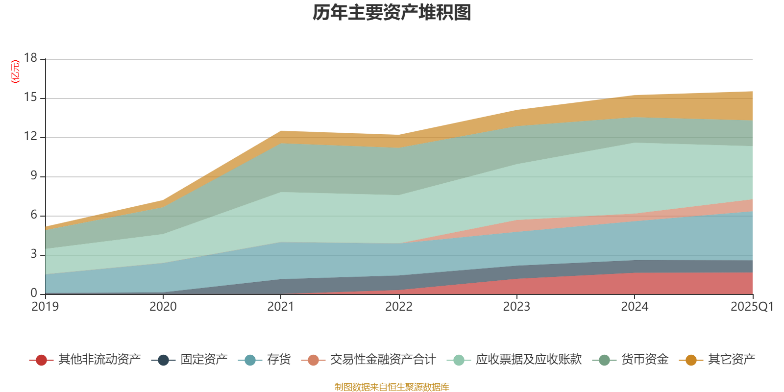 资产重大变化方面,截至2025年一季度末,公司应收票据及应收账款较上年末减少24.98%,占公司总资产比重下降9.41个百分点;存货较上年末增加25.66%,占公司总资产比重上升4.57个百分点;合同资产较上年末增加93.54%,占公司总资产比重上升2.34个百分点;交易性金融资产合计较上年末增加56.11%,占公司总资产比重上升2.05个百分点。