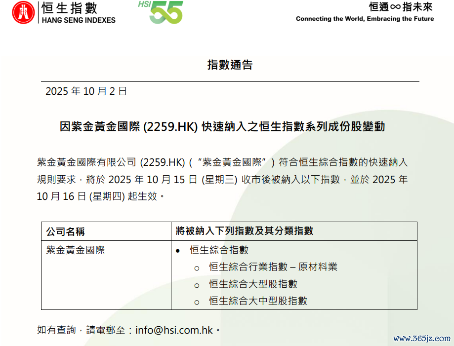 紫金黄金国际将于10月15日收市后被纳入恒生综合指数紫金黄金国际将于10月15日收市后被纳入恒生综合指数。