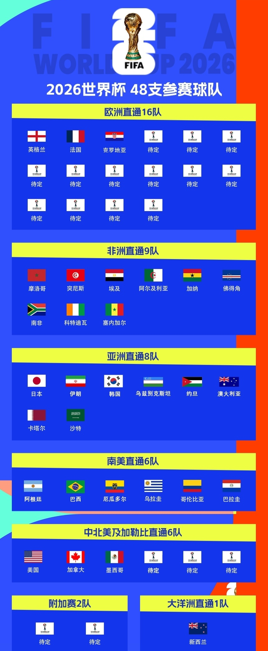 亚洲区:日本、伊朗、乌兹别克斯坦、韩国、约旦、澳大利亚、卡塔尔、沙特